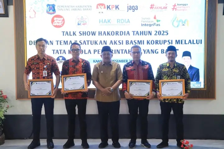 JARIJAMBI.COM, TANJAB BARAT — Bupati Tanjung Jabung Barat Drs. H. Anwar Sadat, M.Ag., menghadiri sekaligus menjadi narasumber utama Talk Show Hari Anti Korupsi Sedunia (Hakordia) Tahun 2025 dengan tema “Satukan Aksi Basmi Korupsi melalui Tata Kelola Pemerintahan yang Baik” di Kantor Inspektorat Kabupaten Tanjung Jabung Barat, Kamis (18/12).
