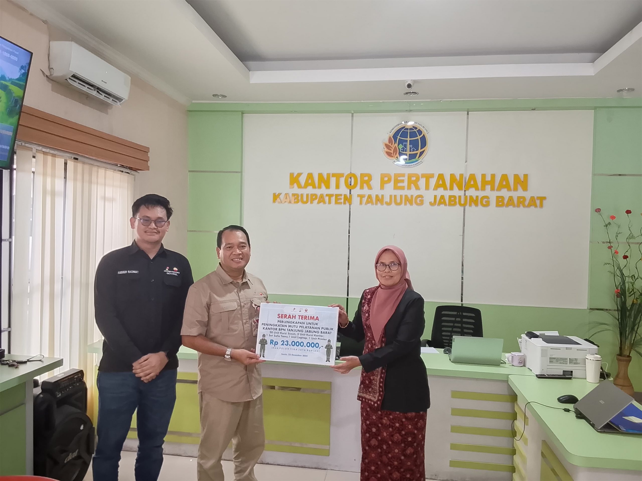 Penyerahan Bantuan Alat Untuk Peningkatan Mutu Pelayanan Publik di BPN Tanjab Barat Langsung diserahkan oleh Lasno, Government and Relation Superintendent kepada Pihak BPN Tanjab Barat.