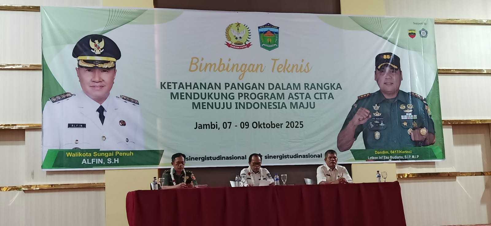 JARIJAMBI.COM, JAMBI — Pemerintah Kota Sungai dan Dandim 0417/Kerinci bekerjasama dengan Sinergi Studi Nasional (SNN) menggelar Bimbingan Teknis (Bimtek) untuk Kepala Desa, BPD, dan BUMDES se-Kota Sungai Penuh. Bimtek denga tema “Ketahanan Pangan Dalam Rangka Mendukung Program Asta cita menuju Indonesia Maju” ini digelar di Aula Abadi Suite Hotel Jambi, Rabu (08/10/2025).
