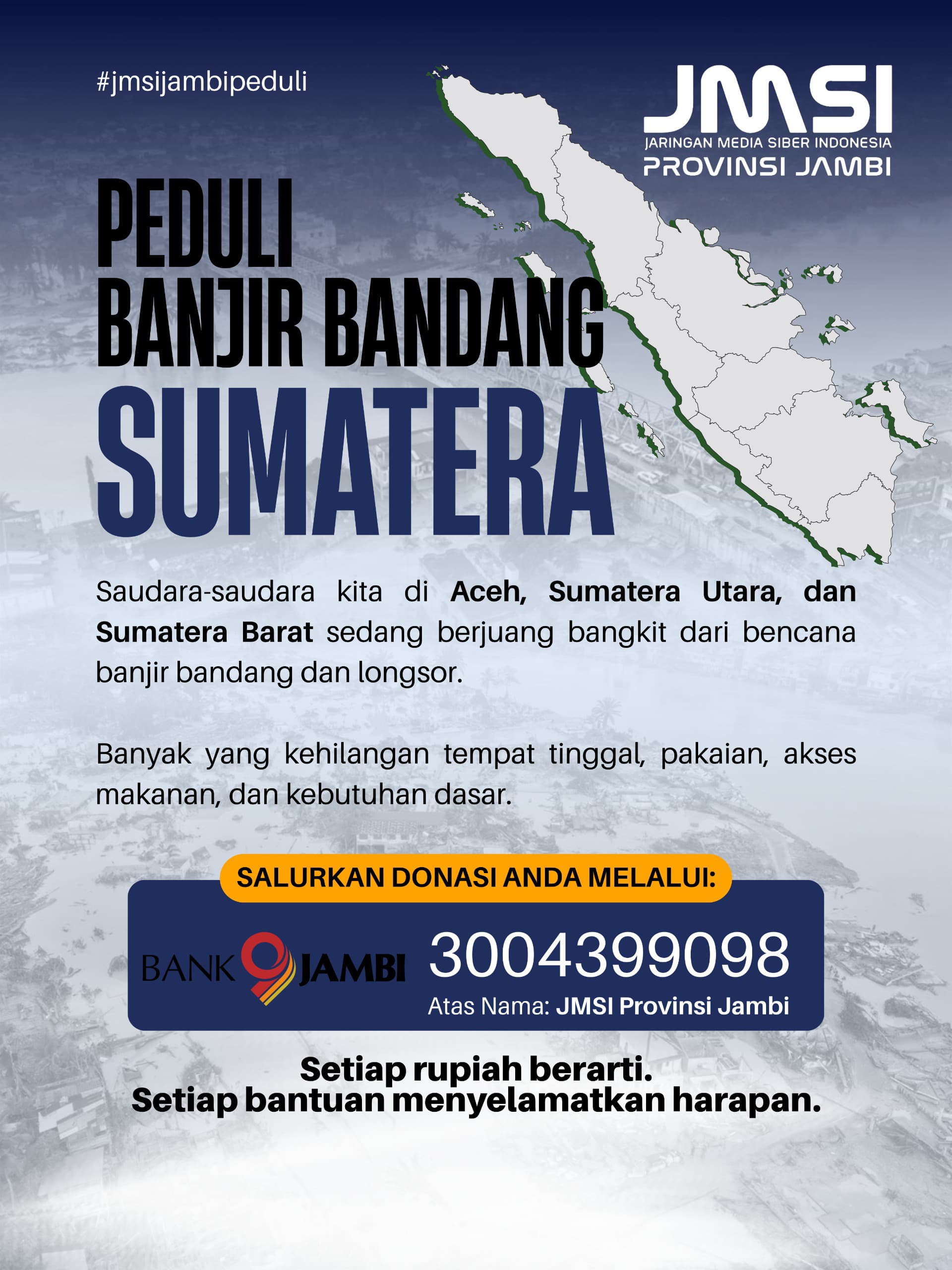 Disampaikannya, para dermawan yang ingin menyisihkan rezekinya untuk membantu para korban bencana Sumatera dapat dikirim melalui rekening Bank Jambi 3004399098, atas Nama JMSI Provinsi Jambi.